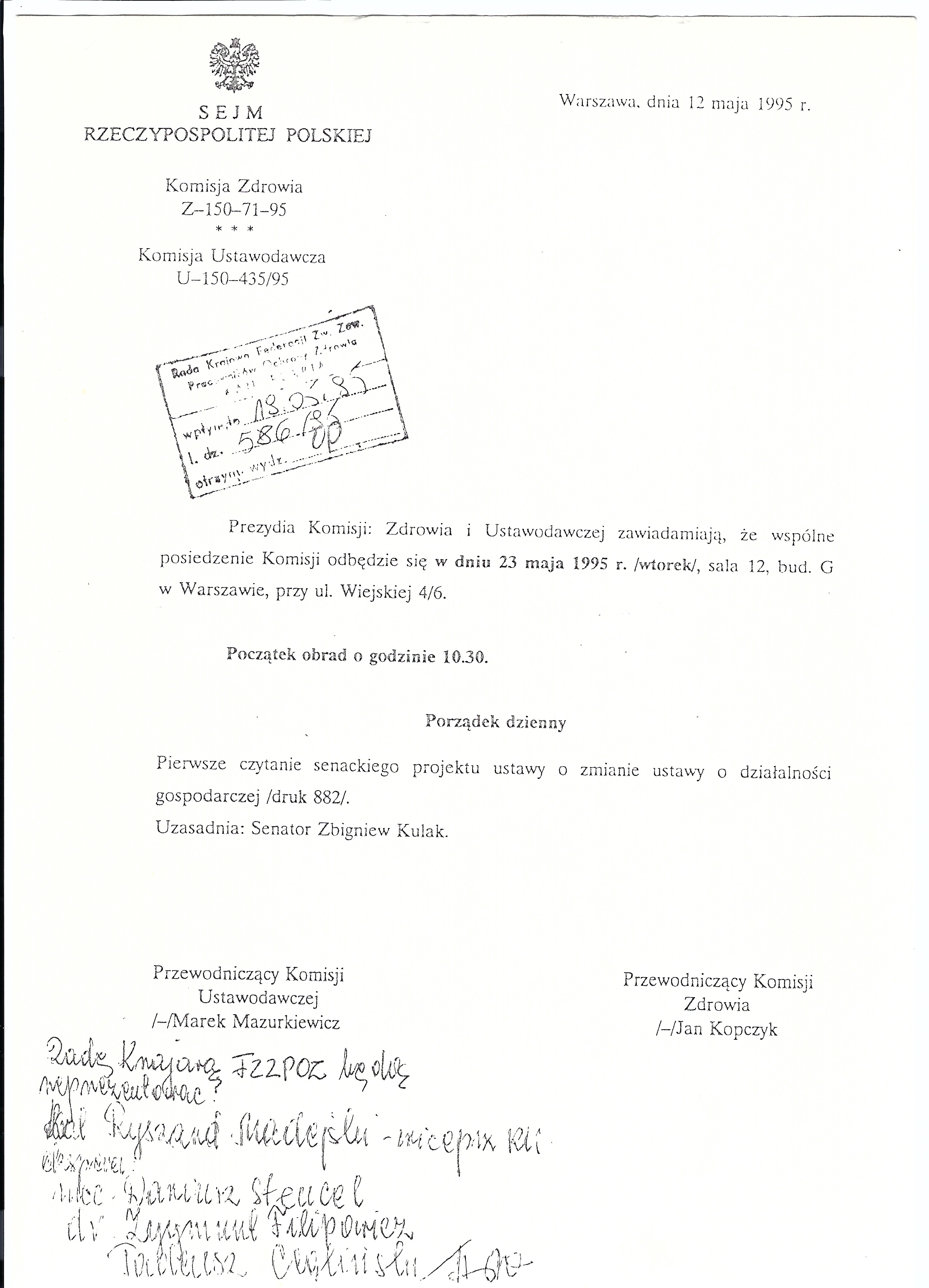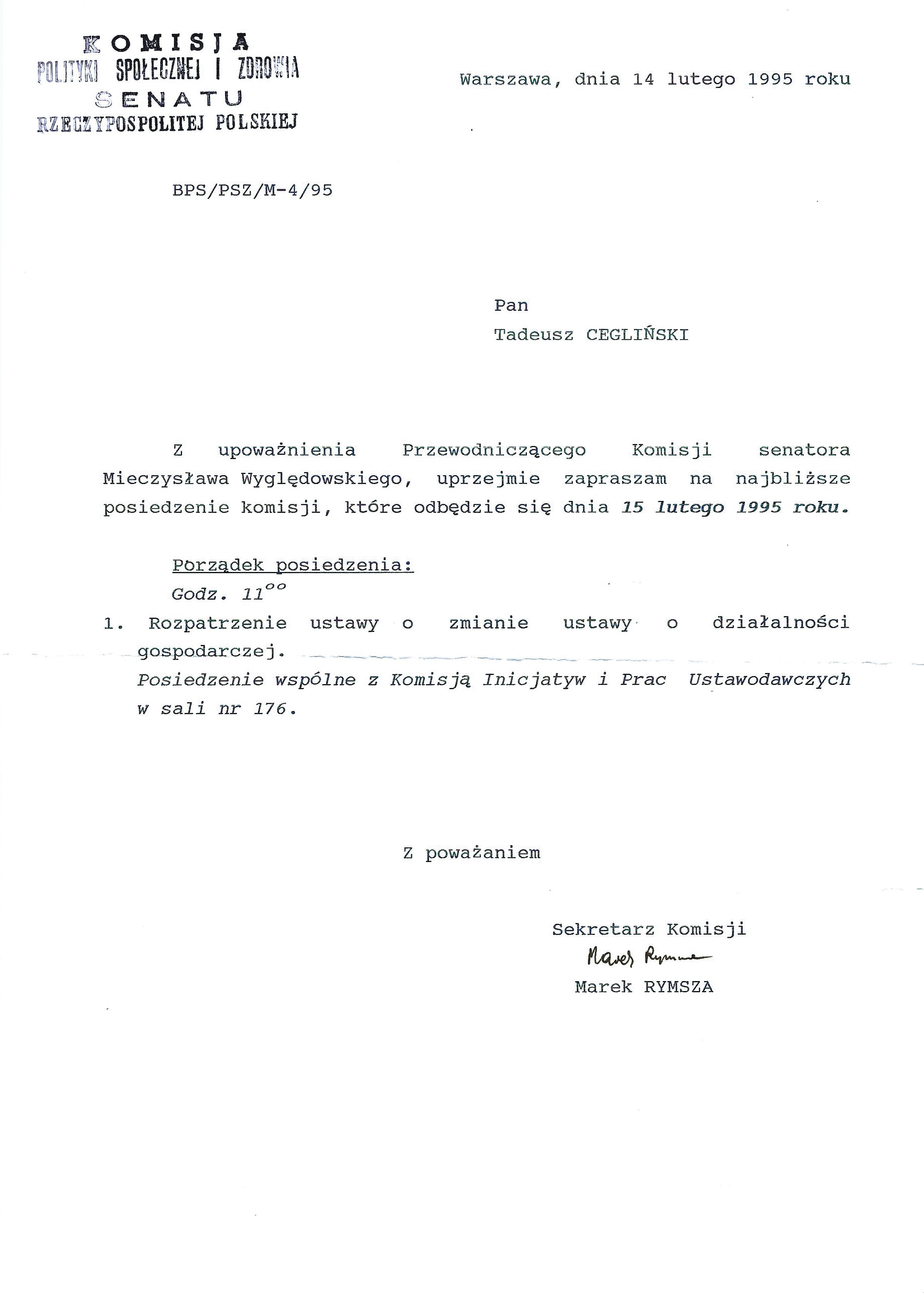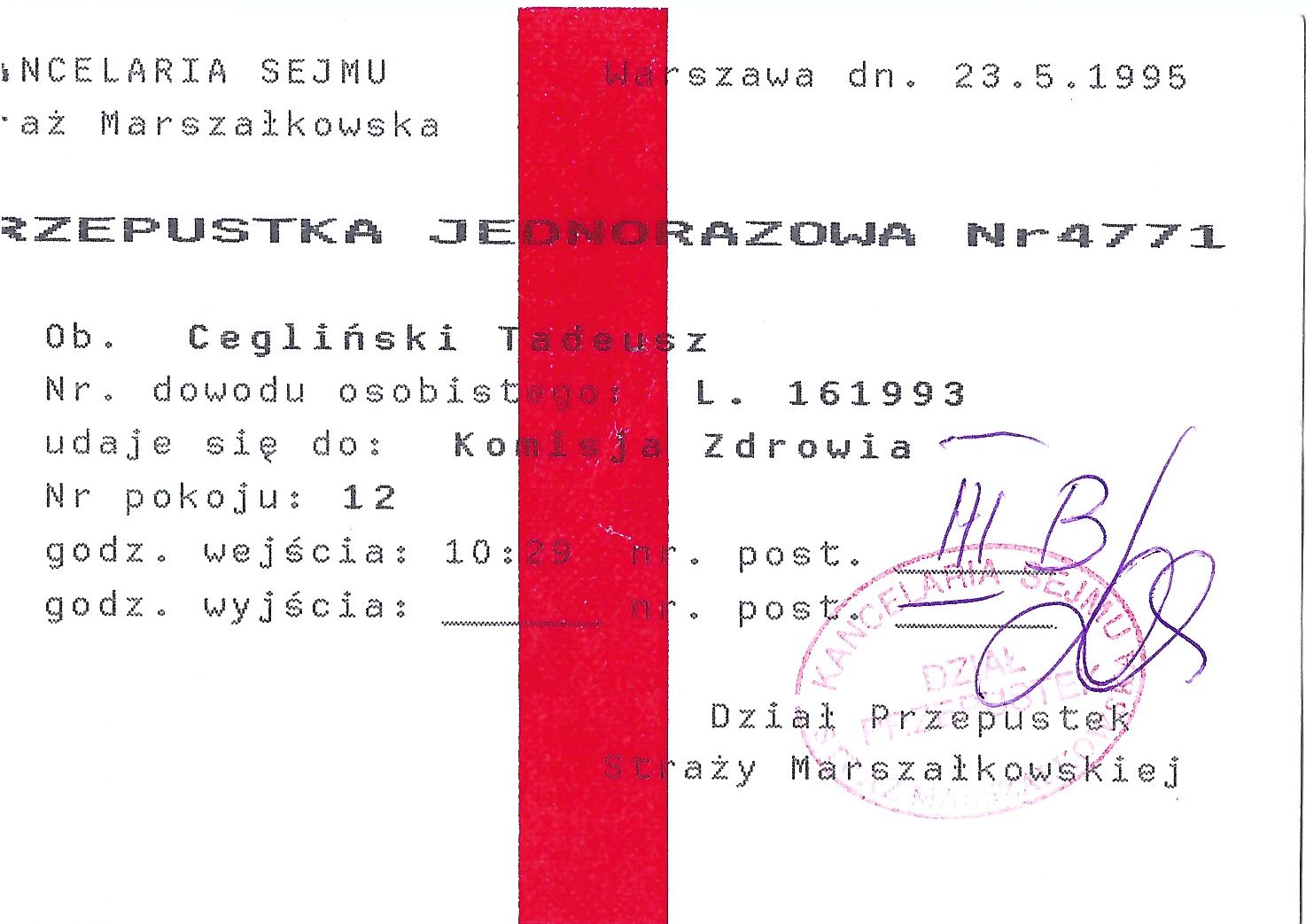 Zaproszenie Tadeusza Ceglińskiego na obrady komisji senackich i sejmowych dowodzą, że posiada on poważanie i autorytet także w państwowych kręgach decyzyjnych, co zapewne nie miałoby miejsca w przypadku wątpliwości co do jego wiarygodności. W 1995 roku Tadeusz Cegliński, jako przedstawiciel Federacji Związków Zawodowych Pracowników Ochrony Zdrowia, występował w roli eksperta na posiedzeniach wspólnych Komisji Polityki Społecznej i Zdrowia z Komisją Inicjatyw i Prac Ustawodawczych Senatu Rzeczypospolitej Polskiej oraz Sejmowej Komisji Zdrowia. Odpierał wówczas zarzuty, których celem było wprowadzenie całkowitego zakazu stosowania tzw. lecznictwa niekonwencjonalnego, w tym bioenergoterapii. Sprawa została wniesiona pod obrady Sejmu w postaci gotowego projektu ustawy o zmianie ustawy o działalności gospodarczej. Demonstrując pozytywny wpływ swoich uzdrowicielskich zdolności, popartych wynikami badań i wspierany przez wiele osób ze świata medycyny i nauki, udało się odrzucić projekt nowelizacji ustawy o działalności gospodarczej, co w efekcie doprowadziło do wpisania bioenergoterapii do indeksu zawodów zatwierdzonego rozporządzeniem Ministra Pracy i Polityki Społecznej. Poniżej fotografie zarchiwizowanych dokumentów – zaproszeń Tadeusza Ceglińskiego na posiedzenia komisji senackiej i sejmowej.